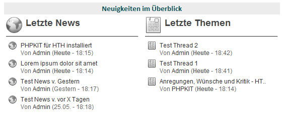 Durch dieses Addon können Sie Sich und ihren Benutzern eine Übersicht über den letzten Forenthemen als auch der letzten News ihrer Präsenz bereit stellen.